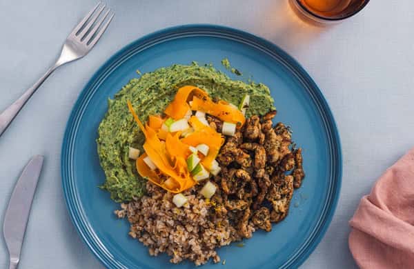 Urtemarinerte svinestrimler servert med en myk blomkål- og spinatkrem, søt bakt purreløk og nøtteaktig mathvete – en enkel, men imponerende hverdagsrett med masse smak og gode næringsstoffer.