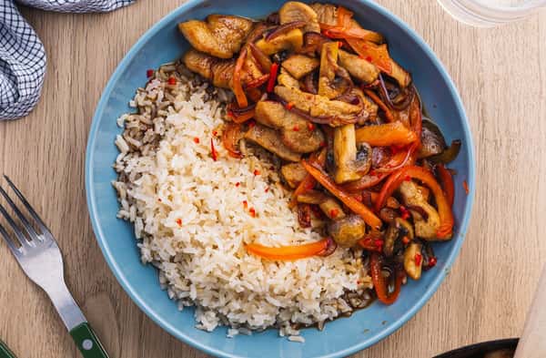 Wok med svinefilet, grønnsaker, fullkornsris og soya- og ingefærsaus